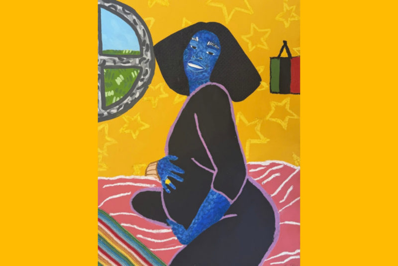 In this grouping of paintings—they are free. “Masterpiece on the Bluff,” “The Inkwell,” and “Mama and We,” are palatable —in that a little Black boy building sandmen from grains of sand; a Black family perched on beach towels and soaking up sunrays; a top-heavy mama and her Black chi’rren, standing in the shallow parts of the ocean water, under a stenciled sky, posing for a photograph feels good and Black. It’s giving Black whimsy in a place where most Black people cannot identify but in ways many Black folks can.
