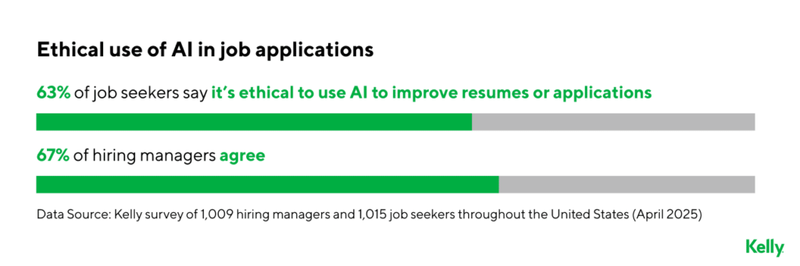 Another point of agreement is on artificial intelligence. Sixty-three percent of job seekers say it is ethical to use AI to improve resumes or applications, and 67 percent of hiring managers agree. Many of those same managers also use AI detection tools to screen applications.