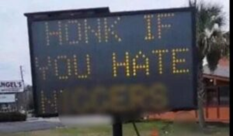 The privately-owned sign was being used to advise drivers about on-going construction. However, on Saturday afternoon the Sumter Police Department began receiving calls about the sign being altered to display “Honk if you hate n******.”