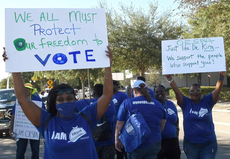 People march with placards in support of voting rights during a parade ahead of Martin Luther King, Jr. Day in Eatonville, Florida, on Jan. 15, 2022. Eatonville is the oldest Black-incorporated municipality in the United States. | Source: SOPA Images / Getty