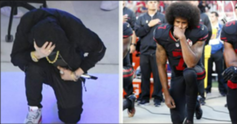 While Dr. Dre played Tupac’s “I Ain’t Mad At Cha” on a nearby piano, Eminem remained on a knee and held his head in his hand. Speculation credits the gesture as a tribute to former quarterback Colin Kaepernick’s protests, in which he used kneeling to protest against police brutality and racial discrimination.