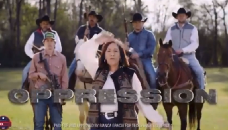 “I’m ready to whip Texas back into shape,” Gracia is heard saying while standing in front of men on horseback who look like they’re filming a Tombstone remake nobody asked for.