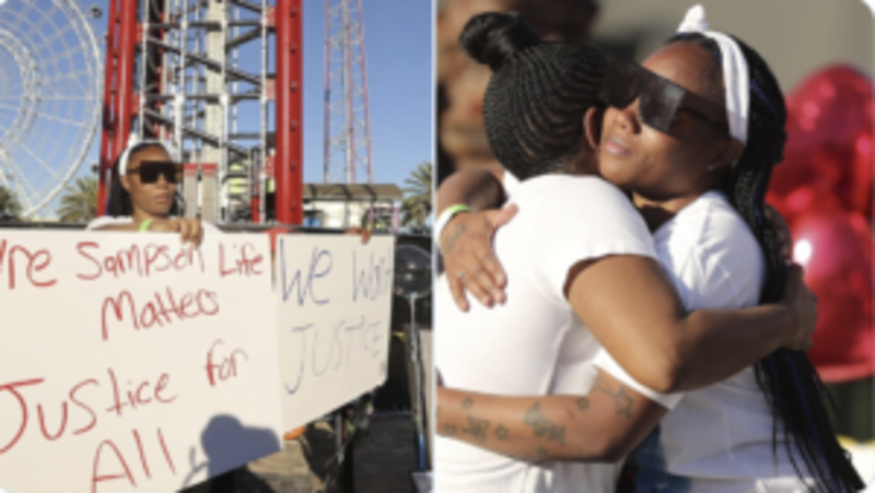 The Orlando Sentinel uncovered “Johnson’s” true identity, her legal name is Lewishena Lavonia Browning, 32. She has paraded before the media giving interview on behalf of Sampson’s family, hugging well-wishers, signing petitions, and leading a vigil outside the Free Fall ride, WFTV-Channel 9 reports.