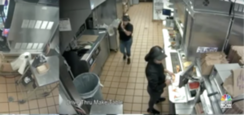 The restaurant’s security video was publicly released without audio. The employee appears to hold a pitcher of liquid as the steam wafts off the top as she talks on her mobile phone, making her way to the counter where the customers are standing and douses them with the heated fluid, NBC News reports.