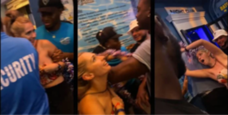 Clips show the woman following the Black man around the bar and grabbing his neck, arms, shoulders, and chest despite his pleas for her to unhand him. Even when security tried to step in to remove the woman, she refused to let go.