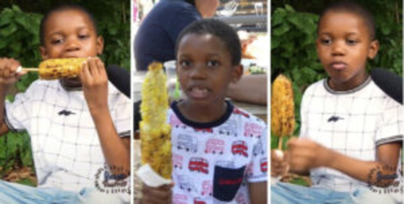 “Ever since I was told that corn was real, it tasted good,” Tariq explains while holding an ear of grilled corn on a stick, adding, “but when I tried it with butter, everything changed!”