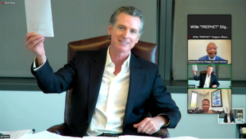 Hip-hop artists Meek Mill, Too $hort, E-40, Killer Mike, YG, Ty Dolla $ign, and Tyga attended a video call with Newsom when he put pen to paper.