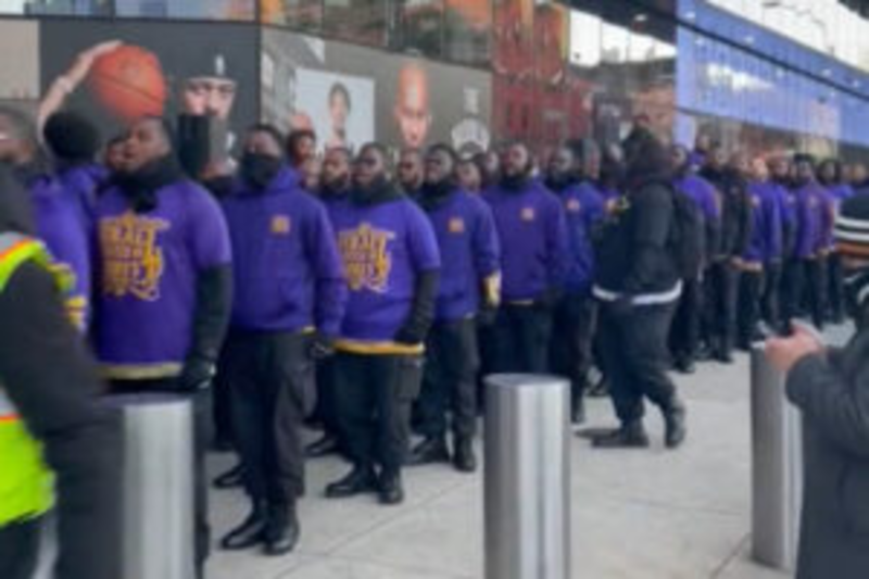 The group donned purple and gold attire while standing outside the Barclays Center singing their chant.