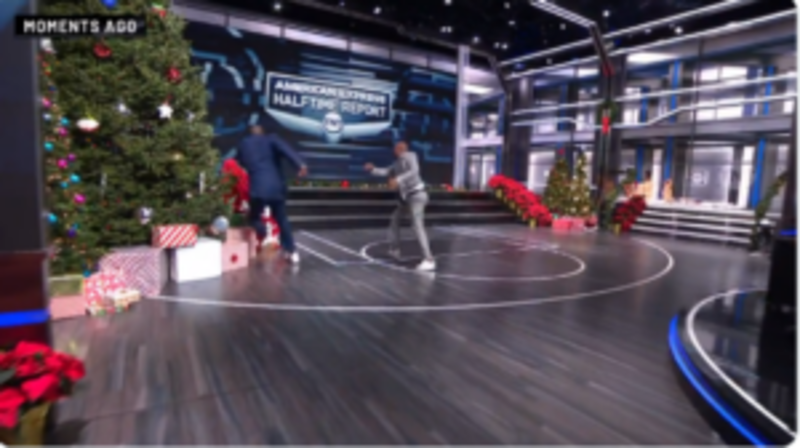 Hilarious video captured the moment Shaq, 50, and Kenny, 57, made a dash for the big screen to cover the Halftime Report when “The Jet” shoved Shaq into the massive Christmas tree on set.