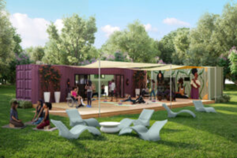 The She Care Wellness Pods were built by S.I. Container Builds, a woman-owned modular construction company that specializes in repurposing shipping containers and building with sustainable materials.